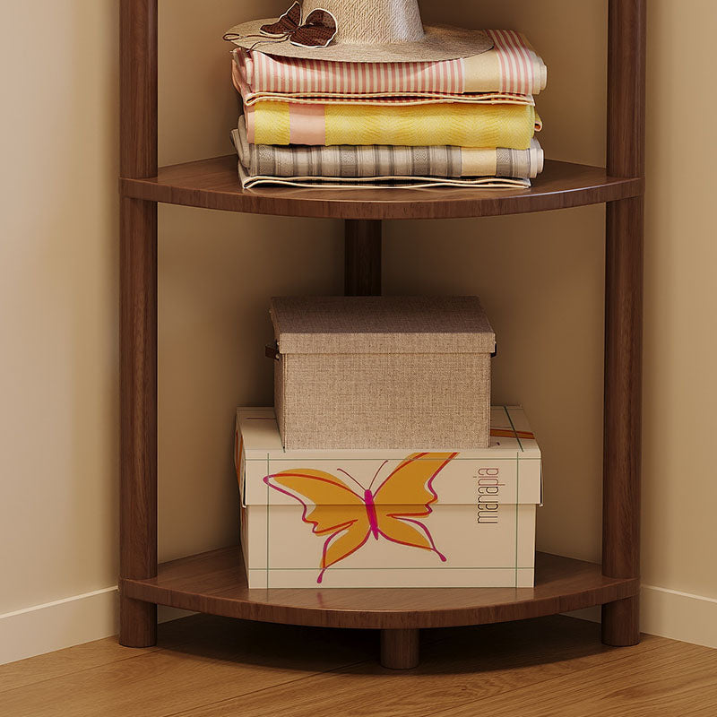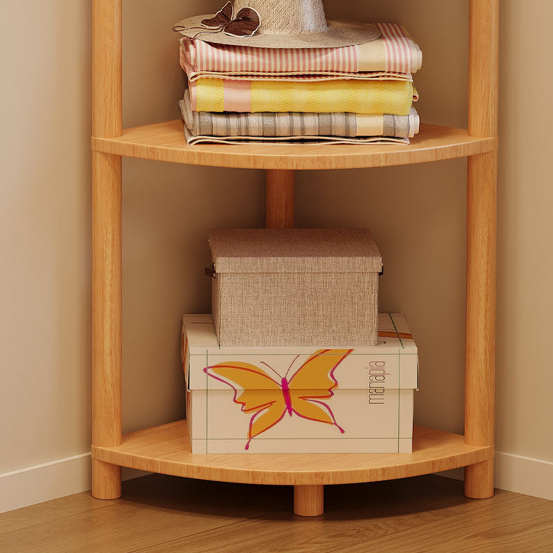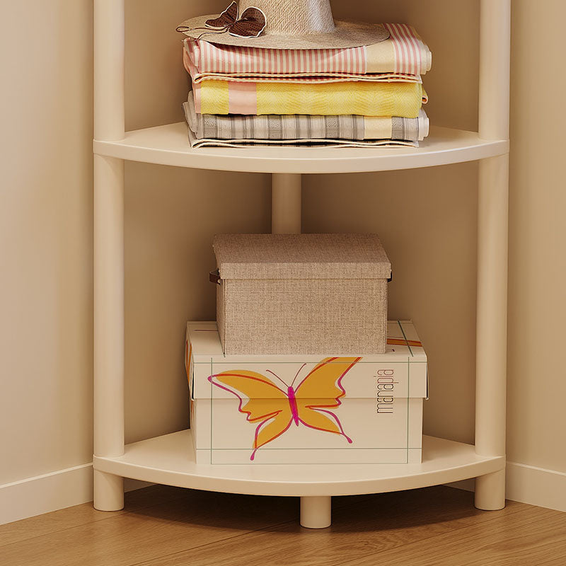 The curved shelf edges prevent items from falling while maximizing storage capacity within the triangular footprint. This thoughtful detail reflects the purpose-built corner optimization rather than simply adapting rectangular shelving to corner placement.